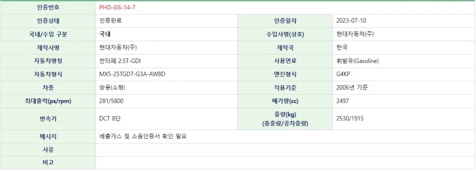 환경부 인증 데이터를 통해 확인된 싼타페 2.5리터 가솔린 터보 모델은 최고출력 281마력을 발휘하며, 8단 DCT가 장착된다. 현행 싼타페 2.5리터 가솔린 터보 모델과 파워트레인 부분에서 변경되는 부분은 없다. 최대토크 역시 43kg.m로 기존과 동일할 것으로 보인다.