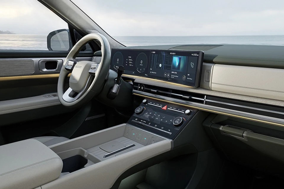 크래시패드는 각지게 떨어지는 라인이 특징이다. 여기에 송풍구와 무드램프에 H 패턴 디자인을 이용하는 등 외관 디자인 기조를 이어갔다. 특히 커브드 디스플레이 하단에 무드램프를 적용해 마치 디스플레이가 떠있는 듯한 모습을 완성했다.