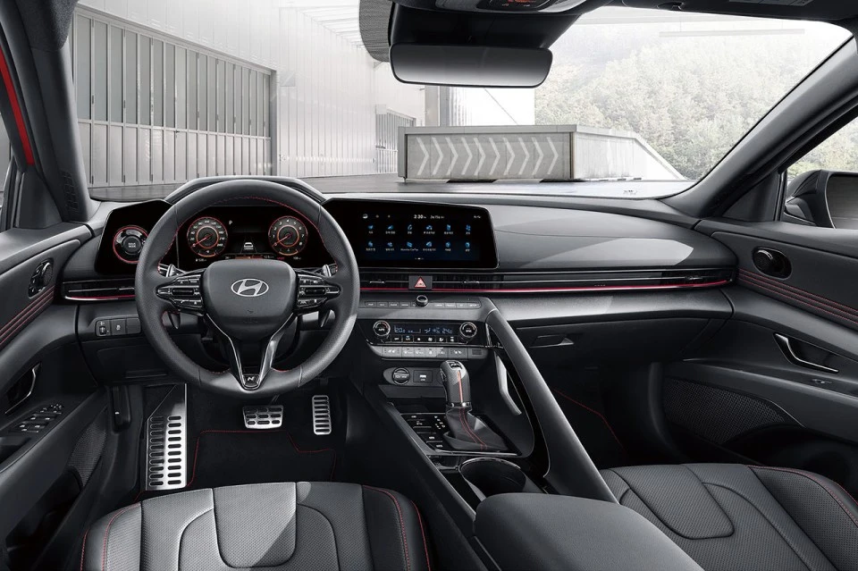 실내 역시 곳곳에 레드 스티치를 적용해 스포티한 느낌을 강조했다. 아반떼 N이 퍼포먼스 블루 컬러를 사용했다면, N 라인은 레드 컬러가 포인트다. 여기에 N 로고가 새겨진 스티어링 휠, 시트, 기어 노브가 특징이다. 또한 아반떼 N 라인의 특징 중 하나인 클러스터 좌측 드라이브 모드 버튼도 유지됐다.