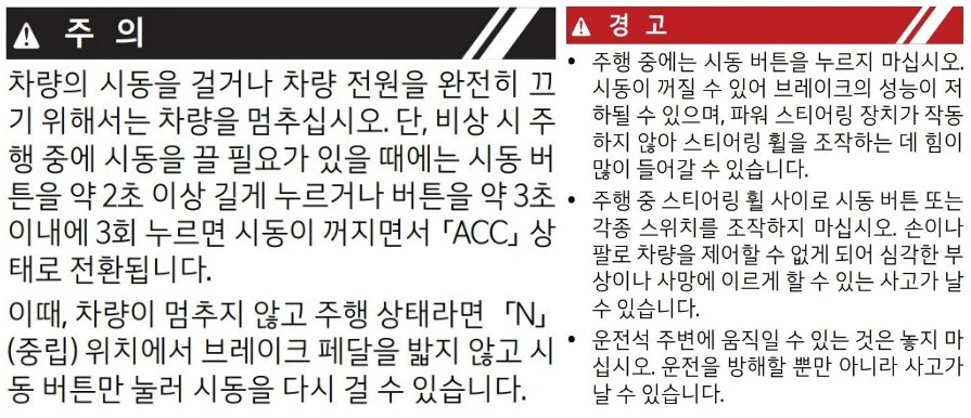 제조사에서는 운행 중 실수로 시동 버튼을 누르는 것에 대비해 시동이 꺼지지 않도록 조치해 놨다. 만약 안전상의 이유로 시동을 꺼야 한다면 제조사마다 조금씩 기준은 다르지만 시동 버튼을 2초 이상 누르거나, 3초 이내에 3번 누르면 시동이 꺼지면서 ACC 상태로 전환된다.