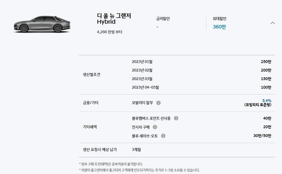 8월부터 하이브리드 모델 역시 재고차 할인을 진행한다. 올해 1월 생산 물량은 250만 원, 2월 200만 원, 3월 150만 원, 4~5월 생산분은 100만 원을 할인해 준다. 그랜저 하이브리드의 경우 모든 할인 혜택을 받을 경우 360만 원까지 할인 받을 수 있다.