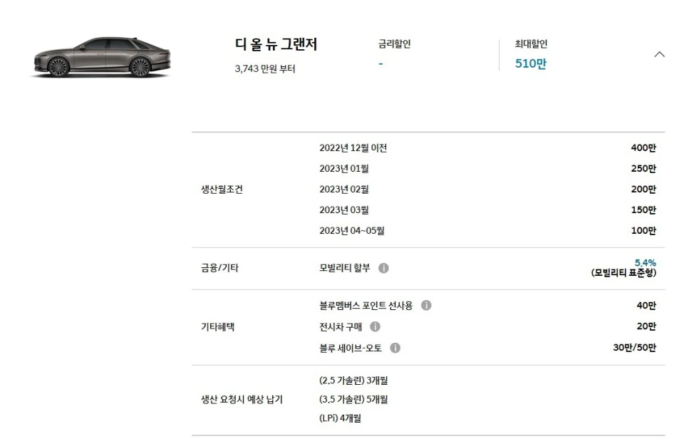 재고차는 생산 월 조건에 따라 할인 금액이 상이하다. 지난해 12월 이전 생산된 차량은 400만 원, 올해 1월 250만 원, 2월 200만 원 3월 150만 원, 4~5월 생산된 차량은 100만 원을 할인해준다.