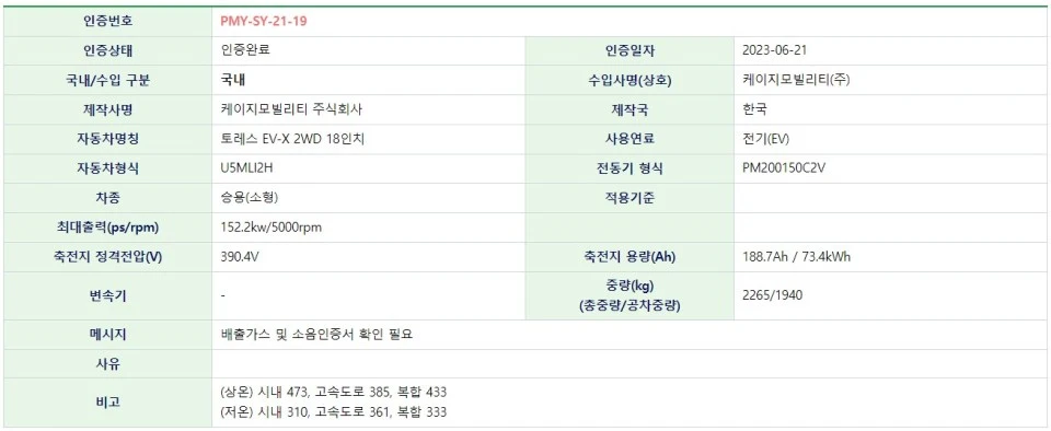 환경부 인증 자료에 따르면 KG모빌리티 토레스 EVX의 상온 주행거리는 복합 433km다. 앞서 공개된 KG모빌리티 측 자체 측정 결과인 420km보다 우수한 수준이다. 상온 기준 시내 주행거리는 473km이며, 고속도로 주행거리는 385km로 확인됐다.