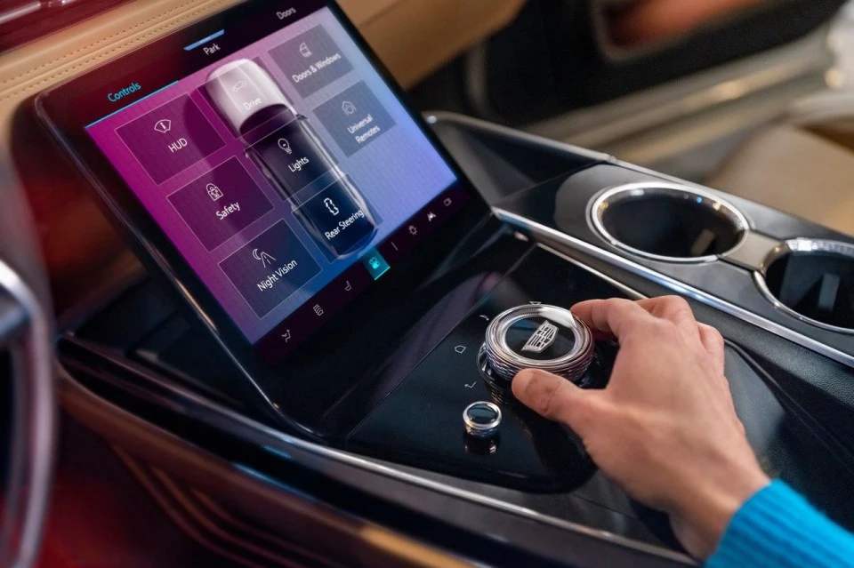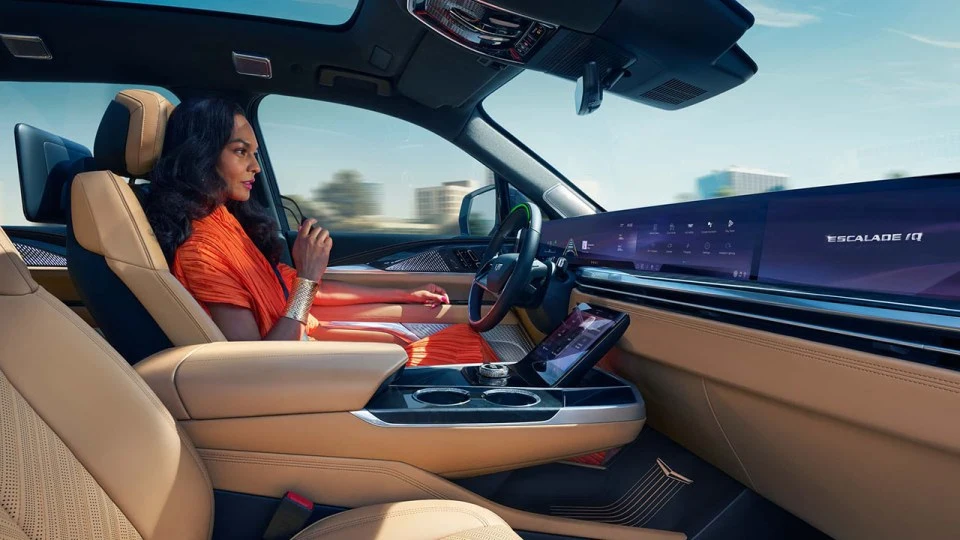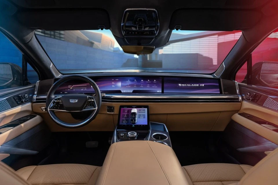 캐딜락 IQ의 실내는 55인치 커브드 디스플레이를 기반으로 화려하고 하이테크한 분위기를 연출한다. 운전자가 조작할 수 있는 범위는 무려 35인치에 달하며, 동승석까지 길게 이어진 디스플레이를 사용해 미래지향적인 느낌을 준다.