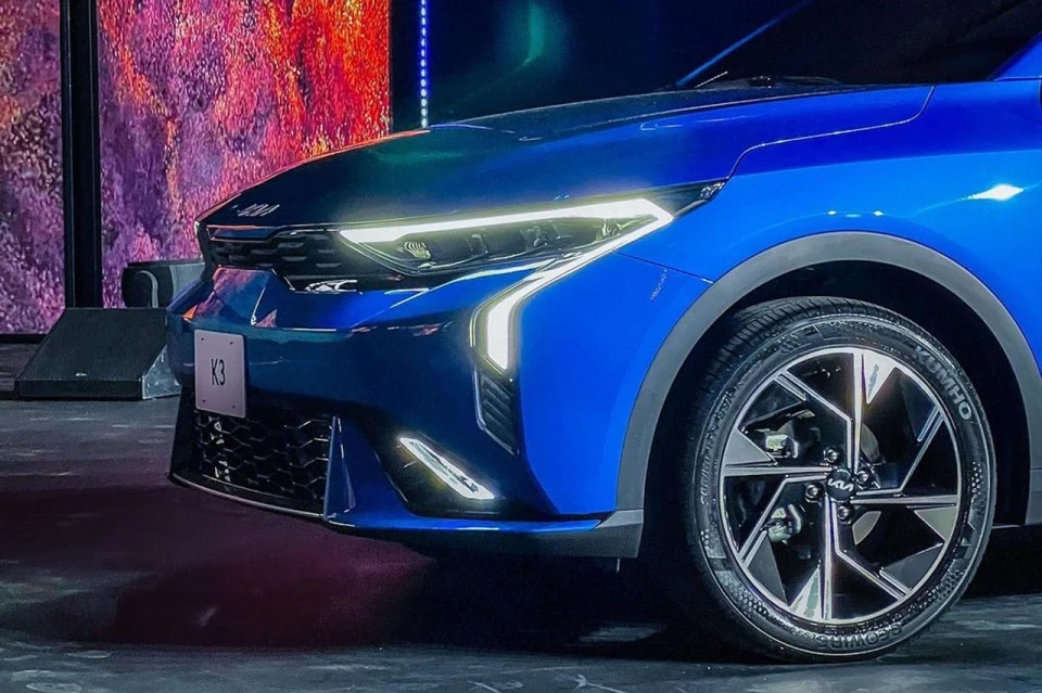 신형 K3의 전면부는 기아의 타이거 노즈 그릴과 램프 라인과 범퍼 라인을 따라 이어지는 주간주행등이 눈에 띈다. 전체적으로 기아 세단 라인업인 국내형 K3와 K5와 유사한 모습인데, 주간주행등 디자인을 통해 새로운 느낌을 연출했다.
