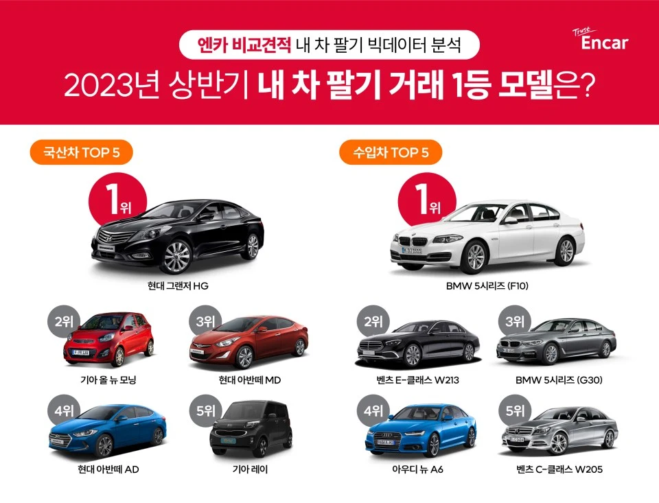 엔카닷컴이 올해 상반기 내 차 팔기 거래 모델 순위를 공개했다. 1위는 ‘현대 그랜저’와 ‘BMW 5시리즈’였으며, 국산차는 경차와 준중형, 수입차는 독일 세단을 중심으로 판매가 많이 이뤄졌다고 밝혔다. 이번 분석 결과는 올해 1월부터 6월까지 내 차 팔기 서비스 ‘엔카 비교견적’을 통해 최종 거래 완료된 모델의 빅데이터를 기반으로 산출됐다.