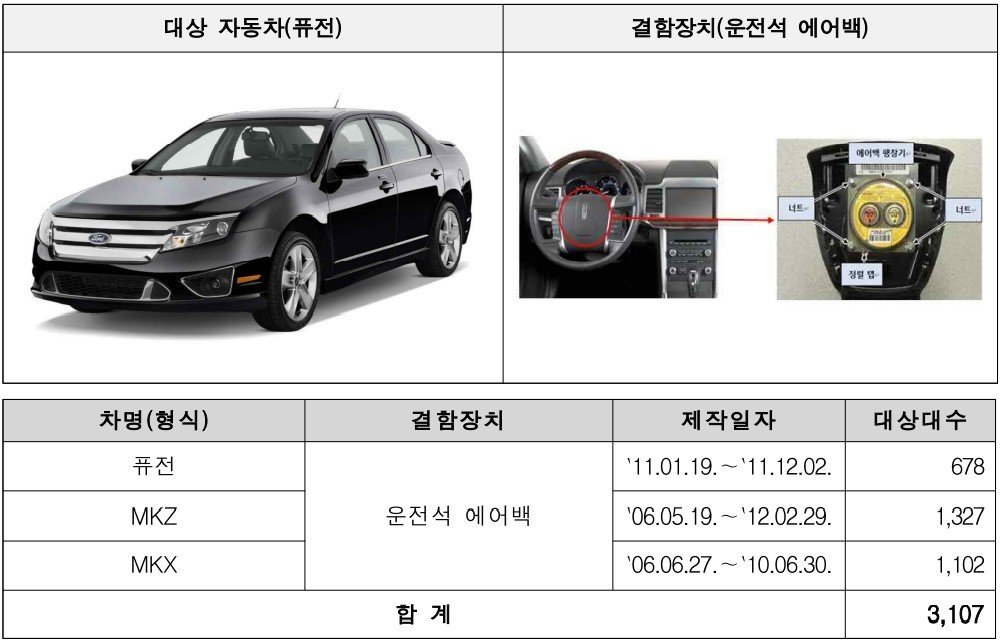 퓨전 등 3개 차종 3,107대는 운전석 에어백 전개 시 인플레이터의 과도한 폭발압력으로 내부 부품의 금속 파편이 운전자에게 상해를 입힐 가능성이 확인되어 자발적 리콜에 들어갑니다. 해당 차량은 2월 28일부터 포드코리아 공식 서비스센터에서 무상으로 수리(소프트웨어 업데이트, 부품 교체)를 받을 수 있습니다.