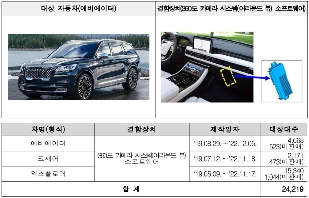 포드코리아에서 수입, 판매한 에비에이터 등 3개 차종 2만4,219대(판매이전 포함)는 360도 카메라 시스템(어라운드 뷰)의 소프트웨어 오류로 후방카메라 화면이 표시되지 않아 후진 시 충돌이 발생할 가능성이 확인됐습니다.