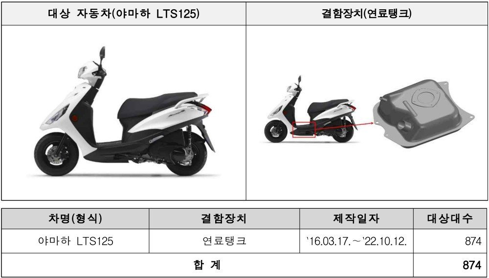한국모터트레이딩에서 수입, 판매한 야마하 LTS125 이륜차종 874대는 연료탱크 내 외부 충격 완화 부품의 누락으로 불규칙한 노면 주행시 연료탱크 용접부에서 균열이 발생하고, 이로 인한 연료 누유로 화재가 발생할 가능성이 확인됐습니다. 해당 차량은 3월 3일부터 한국모터트레이딩 공식 서비스센터에서 무상으로 수리(개선된 부품 교체)를 받을 수 있습니다.