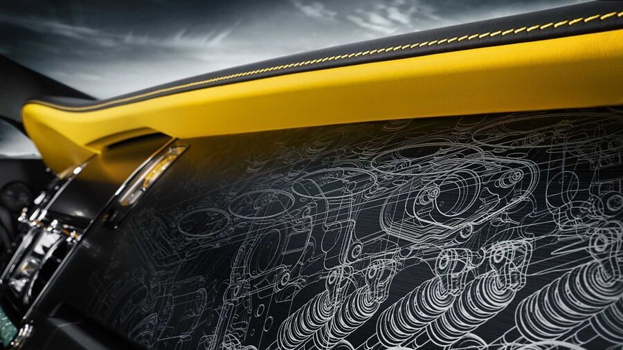 이와 함께, 썬더볼트의 상징이었던 검은 화살 속 노란 원은 하이라이트 색상으로 사용됐습니다. 범퍼 인서트와 비스포크 휠 핀 스트라이프에 브라이트 옐로우 컬러를 적용해 외장과 뚜렷한 대조를 이뤘으며, 라디에이터 그릴과 엔진 사이에 위치한 V 스트럿 역시 최초로 브라이트 옐로우 컬러로 도색됐습니다. 이밖에 환희의 여신상 받침과 링 디테일, 컬렉션 이름 각인에도 동일한 컬러를 적용했습니다.