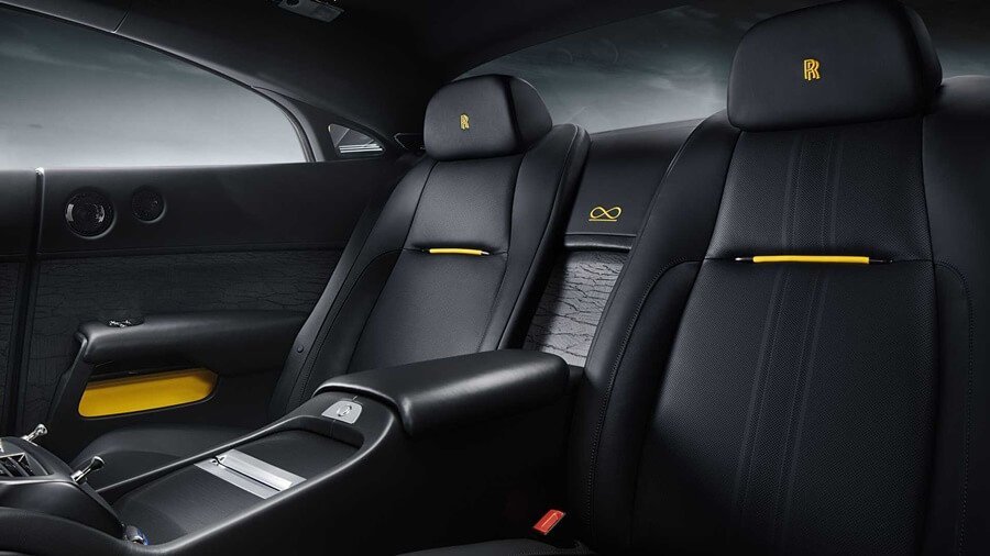 실내 공간 또한 이번 컬렉션을 위해 특별 제작된 새로운 소재로 장식됐는데요. 암레스트와 시트 덧 가죽, 센터 터널, 도어 디테일, 대시보드 패널 하단부 모두 더욱 진한 블랙 컬러와 광택을 입힌 클럽 레더로 마감해 롤스로이스 내추럴 그레인 블랙 가죽과 오묘한 대비를 이뤘습니다. 시트에는 브라이트 옐로우 컬러를 사용해 대담한 매력을 강조했으며, 헤드레스트 측면에는 썬더볼트를 연상케 하는 화살 모티브 자수를 새겨 넣었습니다.