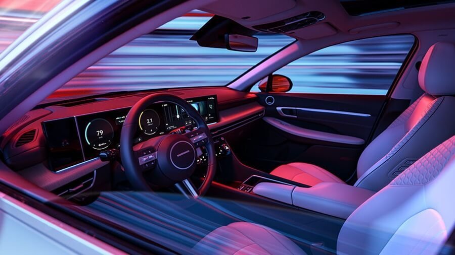 쏘나타 디 엣지 실내 디자인은 운전자의 드라이빙 경험에 초점을 맞춰 스마트하면서도 넓게 느껴지는 공간으로 구성했는데요. 각각 12.3인치의 디지털 클러스터와 인포테인먼트 시스템으로 구성된 디스플레이를 곡선의 형태로 연결한 '파노라믹 커브드 디스플레이'를 최초로 탑재해 운전자의 시인성과 고급스러움을 동시에 높였습니다.