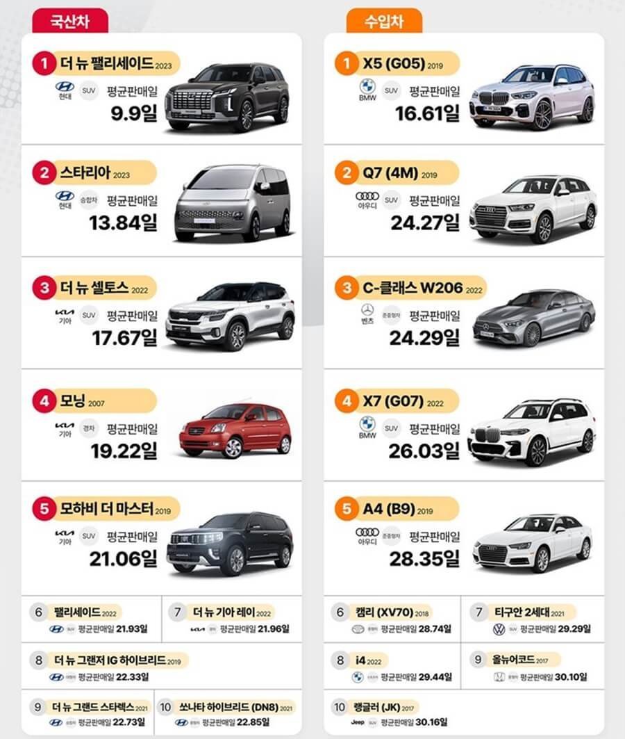 국산차의 경우 가장 빨리 판매된 상위 10개 모델 중에 비교적 최신 연식의 대형 SUV들이 상위권을 주로 차지했는데요. 2023년식 더 뉴 팰리세이드가 9.9일(1위)로 가장 빠른 판매 기간을 기록했으며, 이어 2019년식 모하비 더 마스터는 21.06일(5위)이었습니다. 이전 세대 모델인 2022년식 팰리세이드도 21.93일(6위)로 판매 주기가 빠른 편이었습니다. 소형 SUV 시장에서 인기가 높은 더 뉴 셀토스는 2022년식 모델이 17.67일(3위)로 대형 SUV 인기 속에서 존재감을 나타냈습니다.