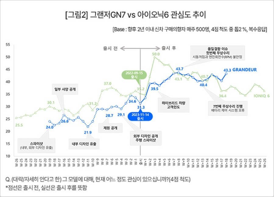 그랜저는 대신 강한 뒷심을 보이고 있습니다. 아이오닉6가 출시 직후 급격히 상승했다가 계속 하락하는 일반적인 곡선을 그린 데 비해 그랜저는 40%대 관심도를 유지하고 있습니다. 출시 8주차(W+8)에는 아이오닉6를 따라잡고 17주차(W+17)부터는 크게 앞서기 시작했습니다. 출시 후 시동꺼짐 등 품질결함이 발견되고 무려 7차례의 무상수리 이슈가 발생했음에도 안정적인 40%대 관심도를 유지하고 있다는 점은 이례적이죠.