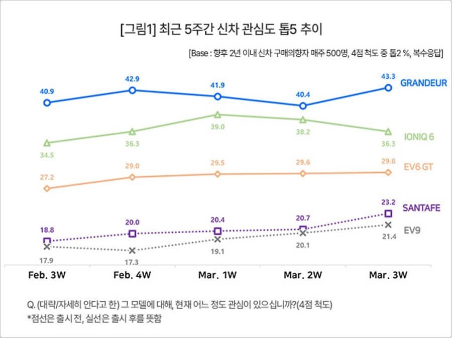 그랜저는 조사에 포함된 35개 모든 신차 모델 중 유일하게 40%가 넘는 관심도를 유지했습니다. 아직 출시 전인 산타페와 EV6에 비하면 2배 정도 높고 국산 전기차로 출시 전후 유례없는 관심을 모았던 아이오닉6와 EV6보다도 앞서가고 있습니다.