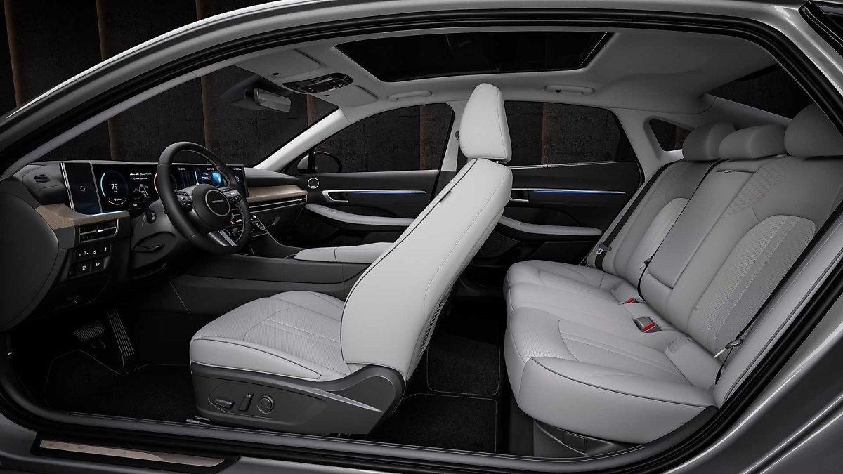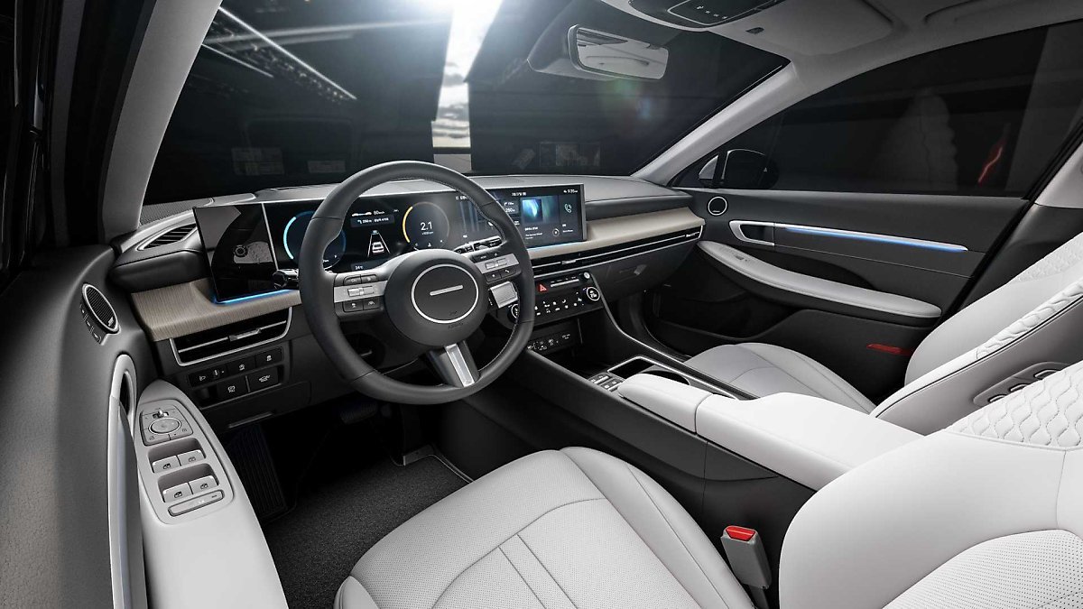 쏘나타 디 엣지 실내 디자인은 운전자 중심 구조를 계승하면서 섬세한 하이테크 디테일을 더해 프리미엄 세단의 감성을 구현했습니다. 특히 현대차 최초로 적용된 파노라믹 커브드 디스플레이는 운전석과 센터페시아까지 디지털 클러스터와 내비게이션 화면이 하나로 쭉 이어져 깔끔하고 세련된 인상을 남깁니다.