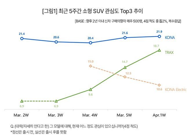 최근 조사(4월 1주차)에서 신차 관심도 톱10에 소형 SUV는 3개 모델이 포함됐습니다. 현대 ‘코나(SX2)’가 21.9%의 관심도로 전체 모델 중 3위를 달렸고, 한국지엠 ‘트랙스’가 18.7%(5위), 현대차의 ‘코나 일렉트릭’ 10.6%(9위) 순이었습니다.
