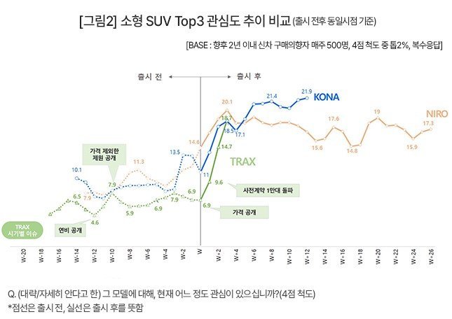 그동안 조사에서 소형 SUV의 출시 시점 기준 소비자 관심도 톱3 모델은 기아 니로 14.6%, 코나 11.0%, 트랙스 6.9% 순이었습니다. 그러나 코나는 출시 후 3주차(W+3)에 첫 고점(18.5%)에 오르고 5주차(W+5, 18.8%)부터 니로를 앞질렀습니다. 그리고 가장 최근인 12주차(W+12)에는 또 한번의 신고점인 21.9%p를 찍으며 보기 드문 2차 상승을 하고 있습니다.