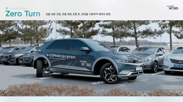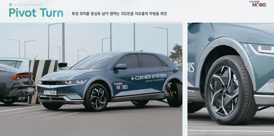 45도 각도로 비스듬하게 달리는 ‘사선 주행’, 운전자가 지정한 차량 내외부 임의의 위치를 중심축 삼아 원하는 각도만큼 차량을 자유롭게 회전시키는 ‘피봇턴’ 모습도 담겼습니다. 사선 주행을 활용하면 부드럽게 앞차를 추월할 수 있고, 전면 주차가 필요한 경우 피봇턴으로 차량을 90도만 돌리면 돼 일반 차량처럼 여러 번 전후진을 반복하거나 크게 선회할 여유공간을 고민하지 않아도 됩니다.