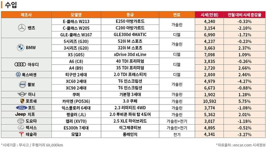 BMW 3시리즈(G20) 320i M 스포츠는 2.37% 시세가 올랐으며 지난달 다소 큰 폭으로 가격이 떨어진 아우디 A4(B9) 35 TDI 프리미엄은 이 달 2.66% 시세가 상승했습니다. 반면, 볼보 XC60 2세대 T6 인스크립션은 전월 대비 4.27% 하락해 수입차 중 가장 많이 가격이 떨어졌습니다.