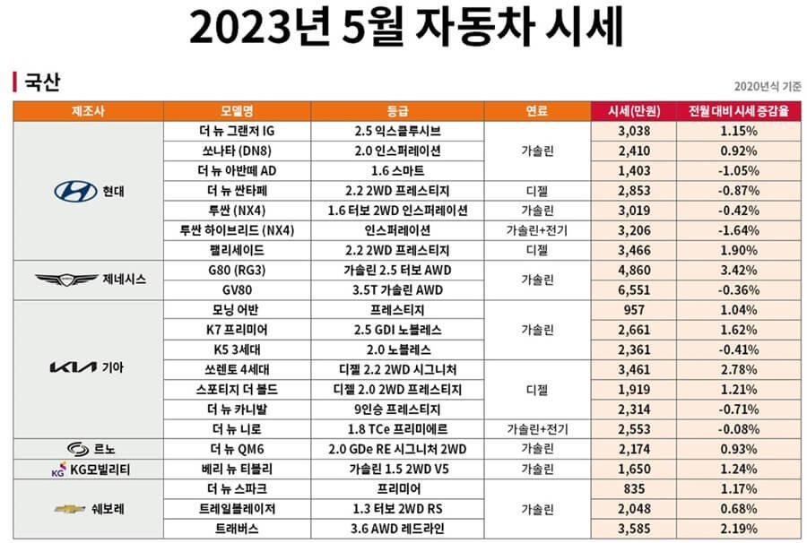 지난달 시세가 하락했던 준중형 SUV 중 기아 쏘렌토 4세대 디젤 2.2 2WD 시그니처, 스포티지 더 볼드 디젤 2.0 2WD 프레스티지, 르노 더 뉴 QM6 2.0 GDe RE 시그니처 2WD도 시세가 반등했습니다. 이 외에 봄 시즌 수요가 집중되는 경차의 수요도 계속 이어지며 시세가 1%대 수준으로 상승했습니다.