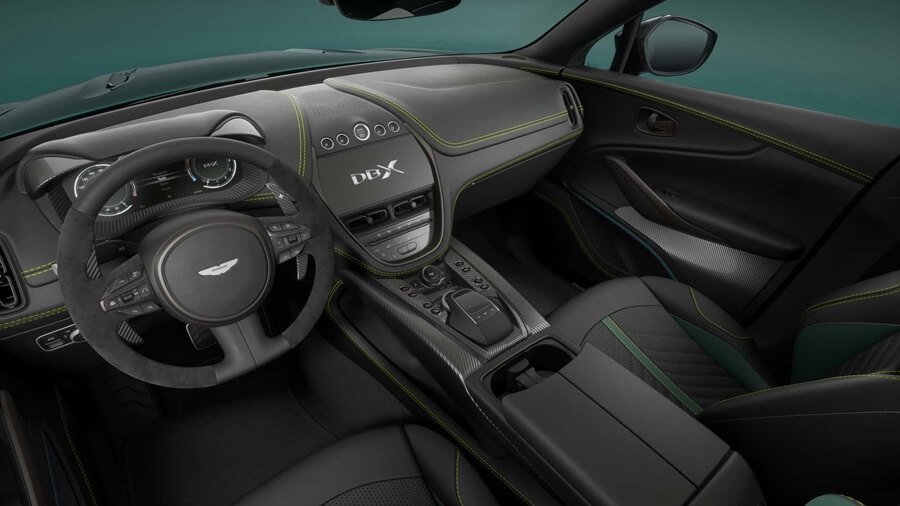 실내 디자인엔 인스파이어 스포츠 듀오 톤 오닉스 블랙과 짙은 초록색의 아이펠 그린 색상을 사용했으며, 라임색 스티칭 디테일을 더했습니다. 도어 실엔 AMR23 로고를 새겨 애스턴마틴의 레이싱 헤리티지를 보여줍니다.