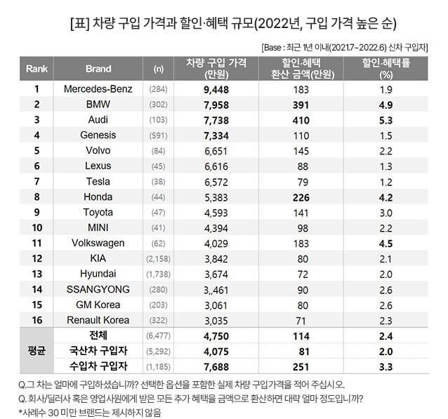 데이터융복합·소비자리서치 전문기관 컨슈머인사이트가 2022년 ‘연례 자동차 기획조사’에서 지난 1년간(2021년 7월~2022년 6월) 새 차를 구입한 고객을 대상으로 그 차를 얼마에 구입했는지, 받은 할인·혜택 규모는 얼마인지 묻고 국산과 수입 브랜드별로 비교했는데요.