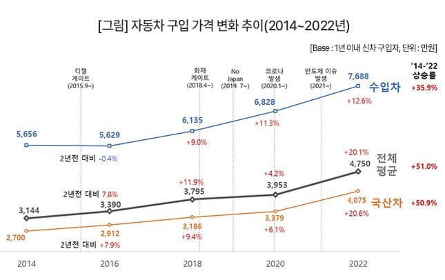 2022년 조사에서 나타난 자동차 평균 구입가격은 4,750만원이었습니다. 2014년 이후 추이를 보면 디젤게이트 직후인 2016년 수입차 구입가격이 소폭 하락한 것을 제외하고는 국산, 수입 모두 꾸준히 올랐습니다. 8년간 국산차 상승률 50.9%로 수입차 상승률 35.9%의 1.4배였습니다.
