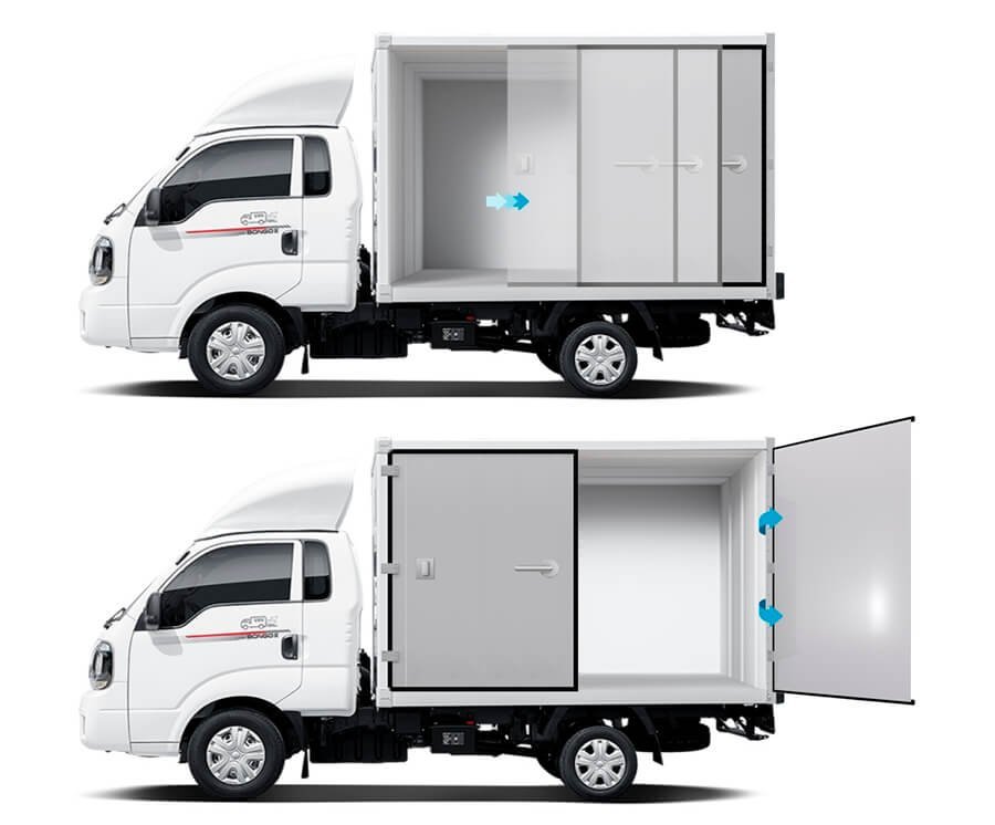 현재 시중에서 볼 수 있는 소형 트럭의 적재함 측면 도어는 대부분 양쪽으로 밀어 여는 방식만 제공되고 있어 일정 크기 이상의 물건을 하차하기 위해서는 후방 도어를 이용해야만 했습니다. 게다가 측면 도어는 전·후방 단차로 인해 구조적으로 적재공간 안쪽으로 문이 이동되기 때문에 도어 두께만큼 내부공간의 손실이 발생합니다.
