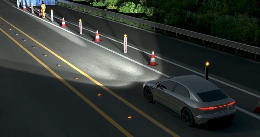 현대모비스의 HD 라이팅 시스템의 특징은 카메라 센서나 내비게이션이 제공하는 정보를 실시간으로 반영한다는 점인데요. 예를 들어 공사 구간에 가까이 이르면, 운전자 전방 시야 15미터 앞에 1.5미터 크기의 '공사 중' 기호를 표시하고, 제한속도도 알려줄 수 있습니다. 야간 운전자의 시인성을 높여 사고 예방에도 특화된 기술입니다. 운전자는 전방을 주시하면서도 방지턱이 언제 나오는지, 고속도로 진출입 경로는 어디인지 쉽게 인지할 수 있습니다.