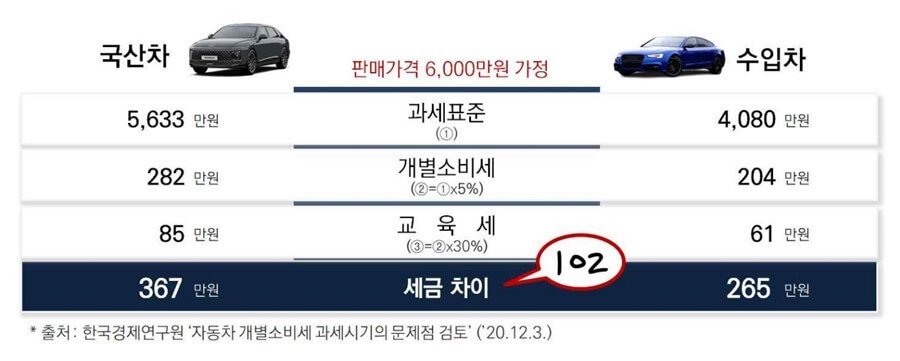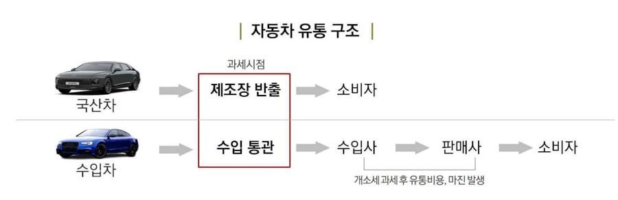 그동안 국산차는 판매 단계의 유통 비용과 이윤을 포함한 가격에 세금을 부과했습니다. 반면, 수입차는 이를 제외한 가격에 세금이 부과됨에 따라 국산차에 세금이 더 많이 붙는다는 역차별 논란이 있었습니다.