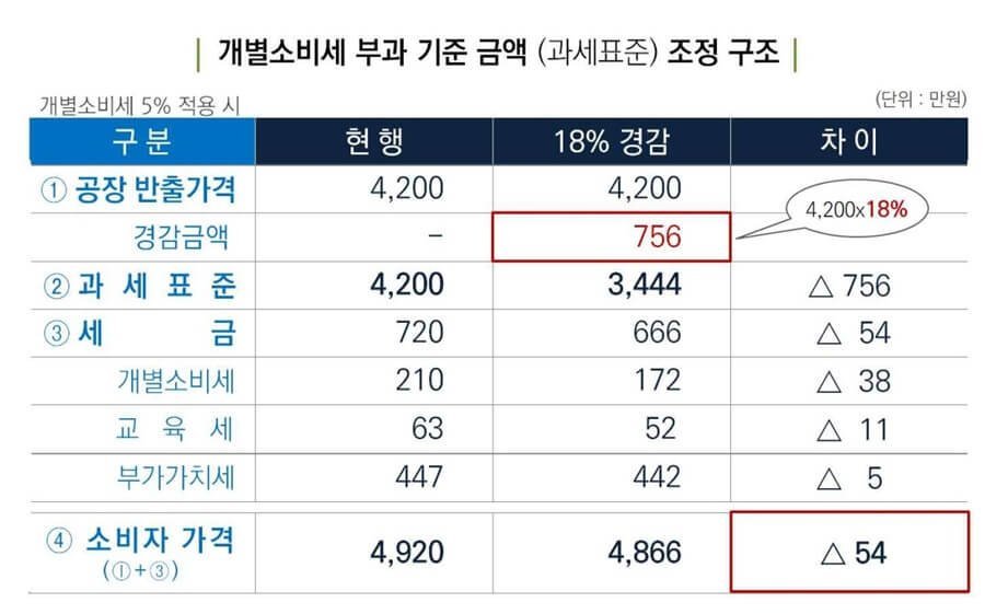 공장 출고 가격이 4,200만원인 현대차 '그랜저'의 경우 4,200만원의 과세표준에 대해 총 720만원(개별소비세·교육세·부가가치세)의 세금이 발생해 소비자 가격은 4,920만원이었지만, 다음 달부터는 4,200만원에서 18% 제외한 3,444만원을 과세표준으로 하면서 부담할 세금은 총 666만원으로 줄어듭니다. 따라서 소비자 가격은 4,866만원으로 총 54만원의 세 부담이 줄어들게 됩니다.