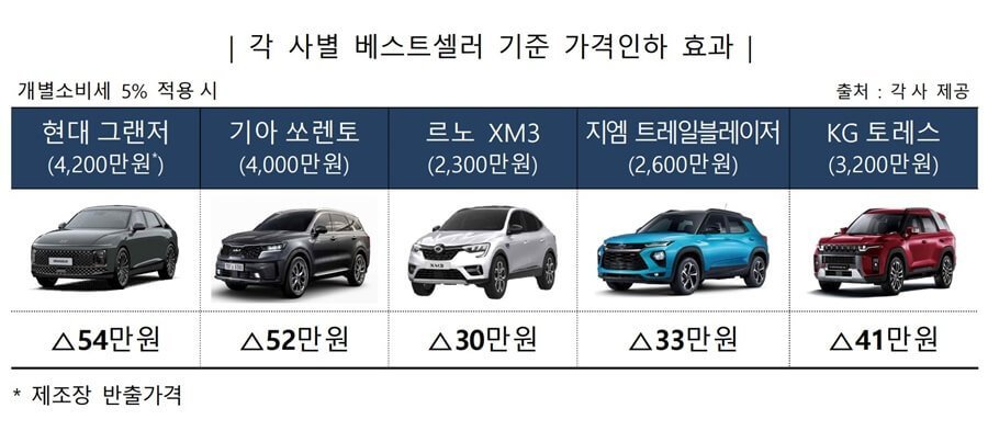 같은 방법으로 각 제조사의 주요 모델에 적용할 경우, 기아 쏘렌토(4,000만원)는 52만원, 르노 XM3(2,300만원) 30만원, 지엠 트레일블레이저(2,600만원) 33만원, KG 모빌리티 토레스(3,200만원) 41만원의 세금 절감 효과를 볼 수 있습니다.