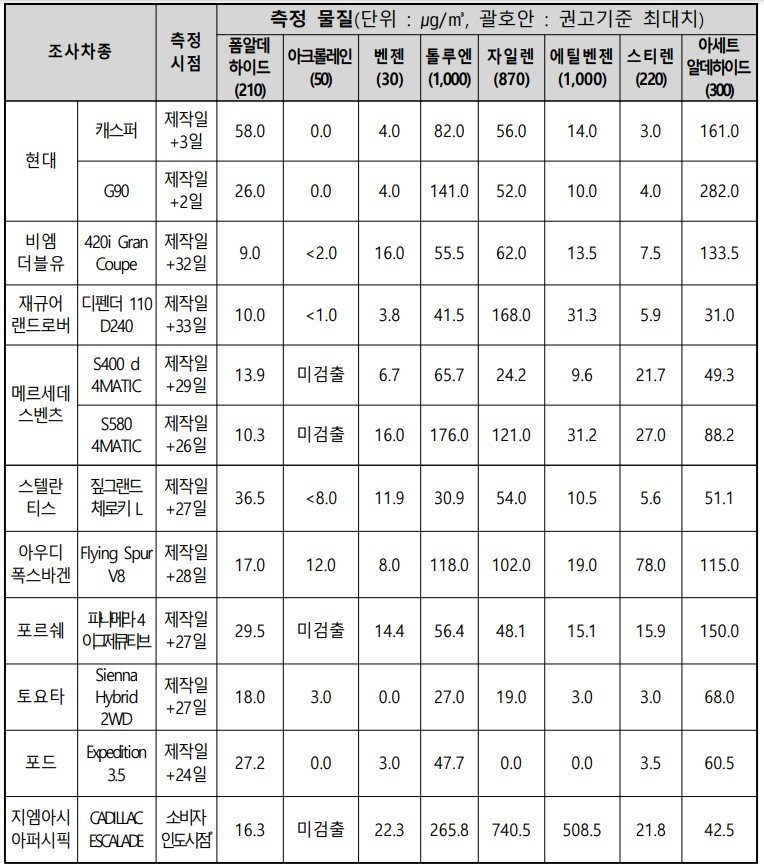 국토부는 2011년부터 매년 국내에서 신규로 제작·판매된 자동차를 대상으로 실내 내장재로부터 방출되는 8개 휘발성 유해물질(폼알데하이드, 톨루엔, 에틸벤젠, 스티렌, 벤젠, 자일렌, 아크롤레인, 아세트알데하이드)의 권고기준 충족 여부를 조사하여 그 결과를 발표해왔습니다.