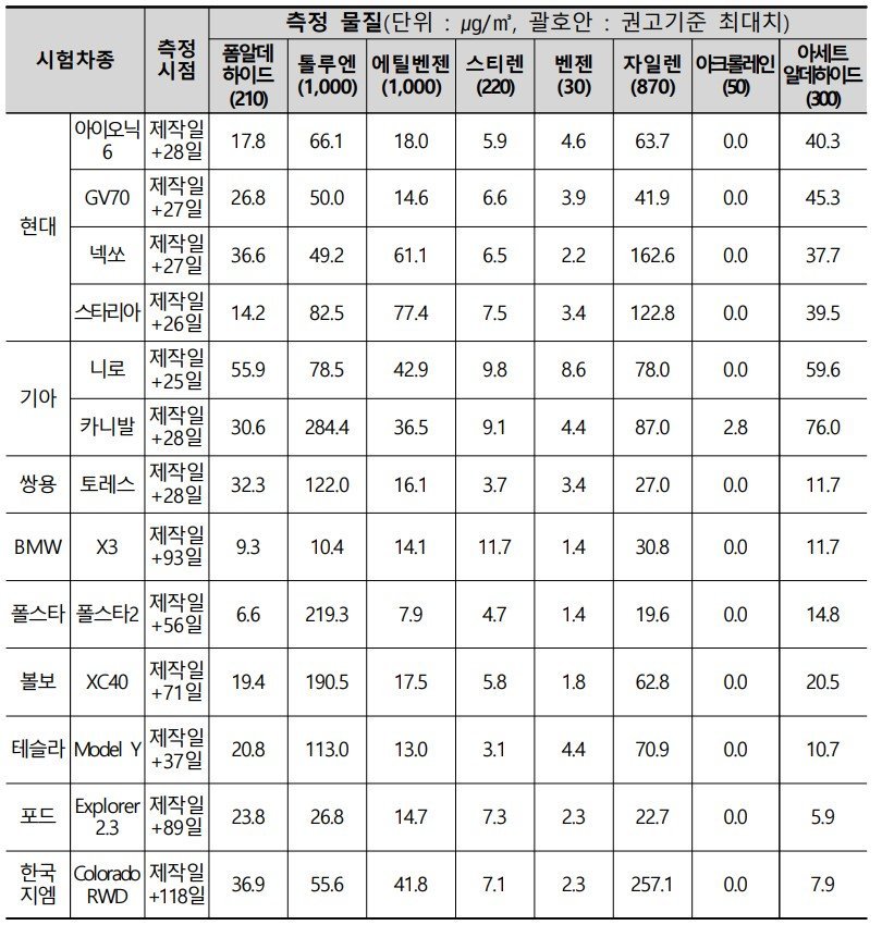 국토교통부가 지난해 신차 25개 차종에 대해 실내공기질 조사를 실시한 결과, 대상 차종 전부 권고기준을 충족한 것으로 확인됐습니다.