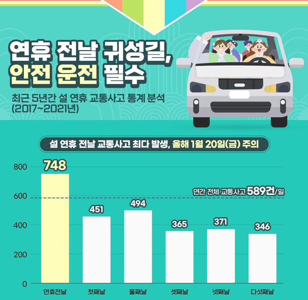 도로교통공단이 최근 5년간(2017~2021년) 설 연휴 교통사고 빅데이터를 분석한 결과, 연휴 전날 교통사고가 가장 많은 것으로 나타났다고 밝히며 1월 20일 귀성길 안전운전을 당부했습니다.
