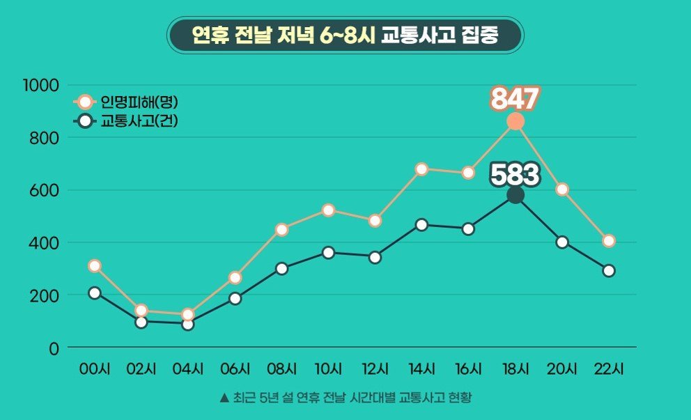 연휴 전날 교통사고는 일평균 748건으로 평소(연간 일평균 589건)보다 23% 많았는데요. 시간대별로는 저녁 6시~8시에 교통사고가 집중되어 연휴 전날 저녁 시간대 귀성차량의 각별한 주의가 필요한 것으로 나타났습니다.