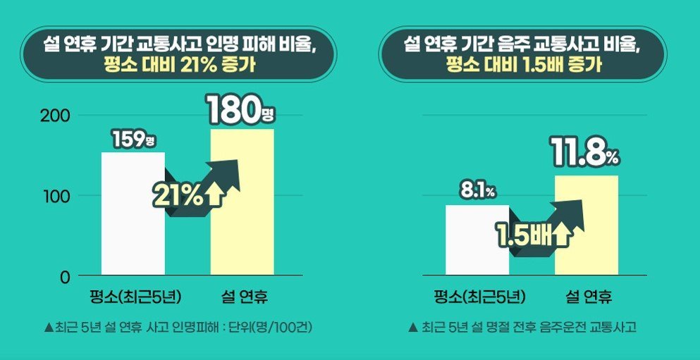 설 연휴기간 일평균 교통사고는 평상시보다 적었으나, 가족단위 이동 증가로 사고 건당 인명피해는 많은 것으로 나타났습니다. 연휴기간 동안 교통사고는 하루 평균 400건으로 평소(589건/일)보다는 줄었으나, 100건당 사상자수는 180명으로 평소(159명)보다 21% 많았습니다.