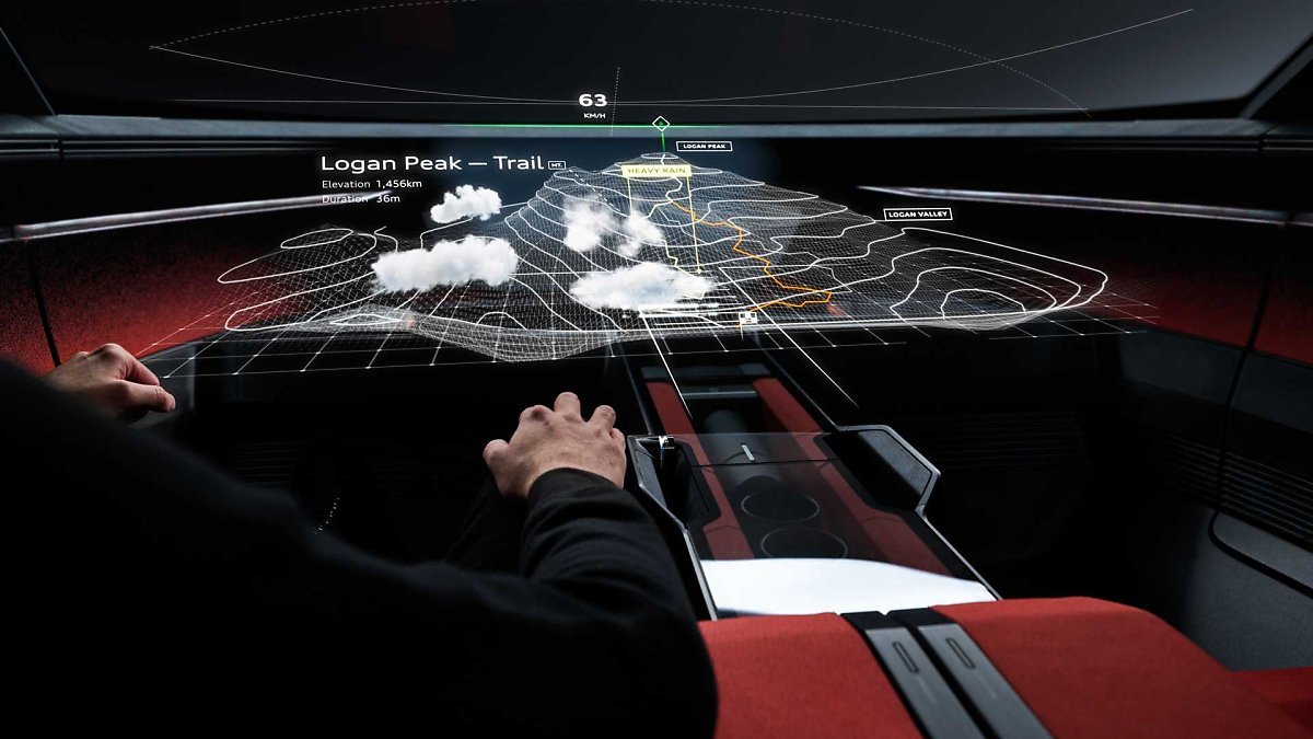 아우디 액티브스피어 콘셉트의 강점은 경계를 초월한다는 것인데요. 실제 현실과 디지털 세상을 통합해 새로운 세상을 만들어내는 시스템이 바로 아우디 디멘션(Audi dimensions)입니다. 사용자는 가상 콘텐츠를 볼 수 있지만 처음에는 정보만 제공됩니다. 사용자가 눈으로 해당 정보를 집중해 바라보면, 시스템은 보다 구체적인 정보를 표시합니다.