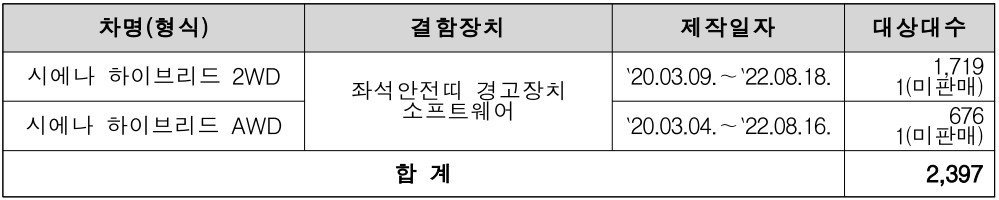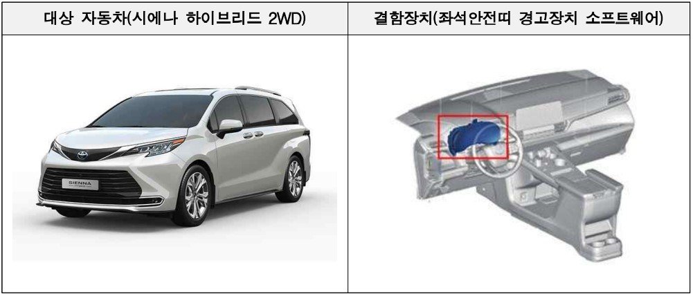한국토요타자동차에서 수입, 판매한 시에나 하이브리드 2WD 등 2개 차종 2,397대(판매이전 포함)는 좌석안전띠 경고장치 소프트웨어의 오류로 좌석안전띠 미착용 경고음이 4초 이상 작동하지 않는 안전기준 부적합 사항이 확인되어 우선 수입사에서 자발적으로 리콜을 진행하였고, 추후 시정률 등을 감안하여 과징금을 부과할 계획입니다. 해당 차량은 2월 23일부터 한국토요타자동차 공식 서비스센터에서 무상으로 수리(소프트웨어 업데이트)를 받을 수 있습니다.