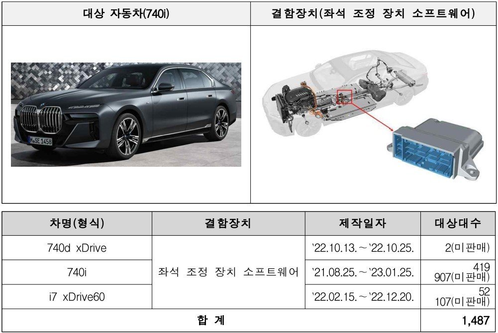 BMW코리아에서 수입, 판매한 740i 등 3개 차종 1,487대(판매이전 포함)는 좌석 조정 장치 소프트웨어의 오류로 조수석 좌석을 앞뒤 방향으로 끝까지 이동 후 같은 방향으로 추가 조정할 경우 좌석의 위치 정보를 인식하지 못하고, 이로 인해 에어백이 작동되지 않아 탑승자가 상해를 입을 가능성이 확인됐습니다. 해당 차량은 2월 21일부터 BMW코리아 공식 서비스센터에서 무상으로 수리(소프트웨어 업데이트)를 받을 수 있습니다.