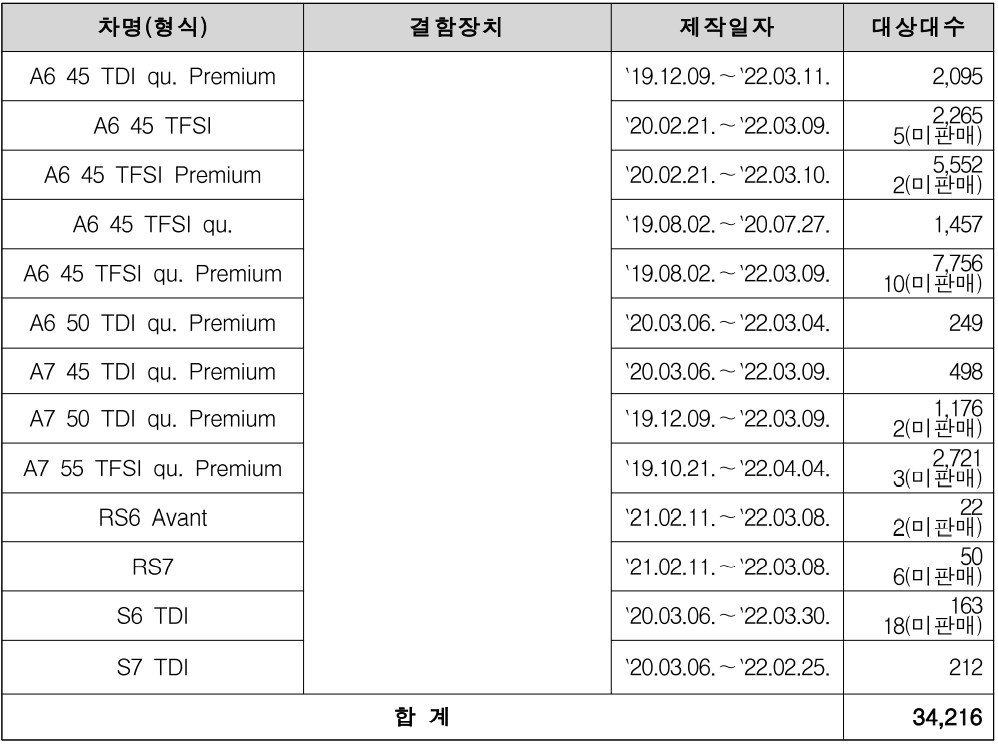 폭스바겐그룹코리아에서 수입, 판매한 A6 45 TFSI 콰트로 프리미엄 등 16개 차종 3만4,216대(판매이전 포함)는 통신 중계(게이트웨이) 제어장치 내 수분 유입에 따른 단락으로 주행 중 엔진 출력이 감소하고, 이로 인해 안전에 지장을 줄 가능성이 확인됐습니다.