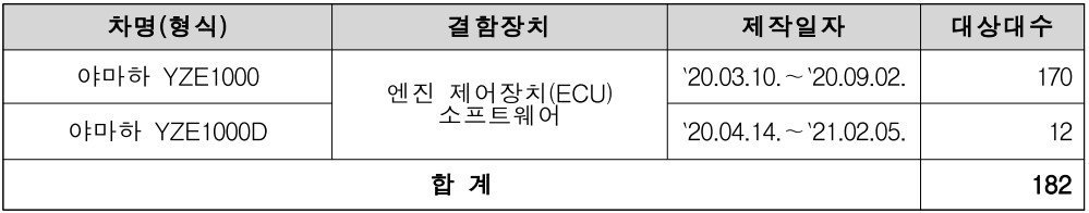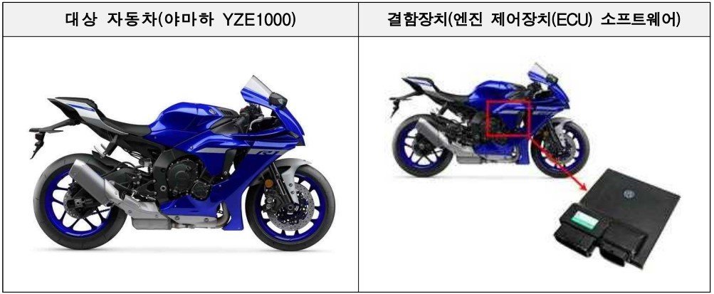 마지막으로, 한국모터트레이딩에서 수입, 판매한 야마하 YZE1000 등 2개 이륜 차종 182대는 엔진 제어장치(ECU) 소프트웨어의 오류로 대기압 센서 고장을 감지하지 못하여 공연비 조절이 제대로 되지 않고, 이로 인해 시동이 꺼질 가능성 확인되어 자발적으로 리콜에 들어갑니다. 해당 차량은 2월 24일부터 한국모터트레이딩 공식 서비스센터에서 무상으로 수리(소프트웨어 업데이트)를 받을 수 있습니다.