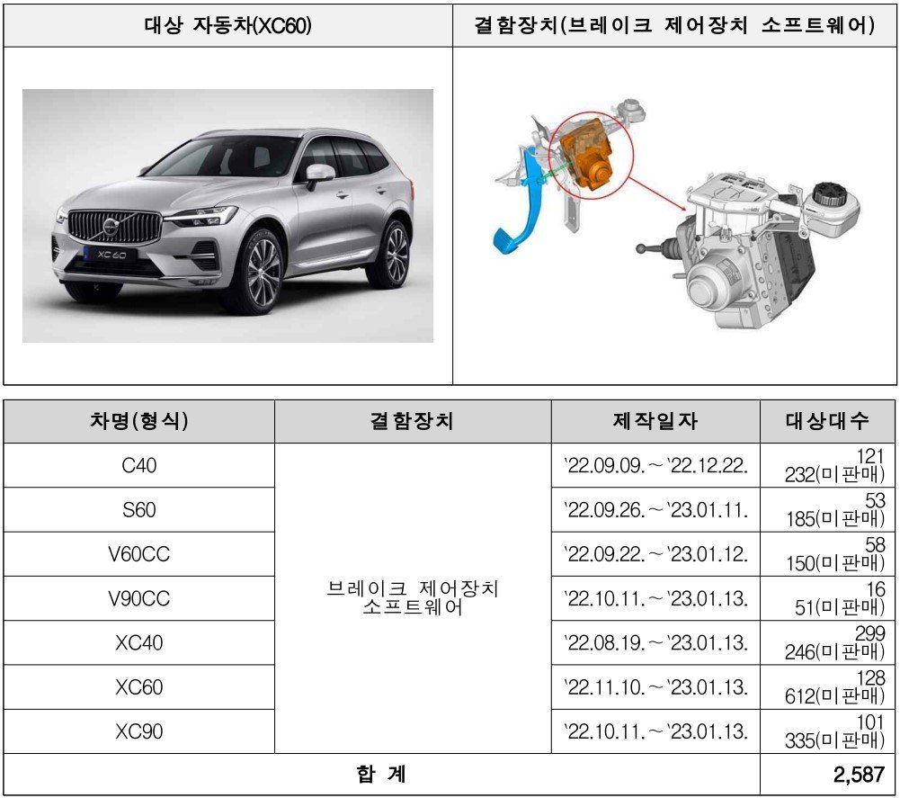 볼보자동차코리아에서 수입, 판매한 XC60 등 7개 차종 2,587대(판매이전 포함)는 브레이크 제어장치 소프트웨어의 호환성 문제로 브레이크 잠김 방지 장치(ABS), 자동차안정성제어장치(ESC) 등이 제대로 작동되지 않아 안전에 지장을 줄 가능성이 확인되어 리콜을 실시합니다. 해당 차량은 2월 17일부터 볼보자동차코리아 공식 서비스센터에서 무상으로 수리(소프트웨어 업데이트)를 받을 수 있습니다.