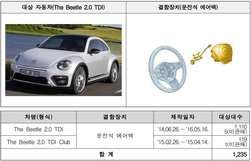 또한 더 비틀 2.0 TDI 등 2개 차종 1,235대(판매이전 포함)는 운전석 에어백 전개 시 인플레이터의 과도한 폭발압력으로 내부 부품의 금속 파편이 운전자에게 상해를 입힐 가능성이 확인되어 자발적으로 시정조치에 들어갑니다. 해당 차량은 2월 17일부터 폭스바겐그룹코리아 공식 서비스센터에서 무상으로 수리(부품 수리 등)를 받을 수 있습니다.