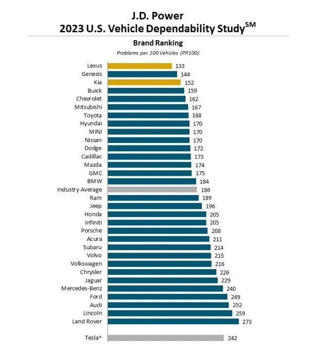 한편, 2023년 내구품질조사는 2019년 7월부터 2020년 2월까지 미국에서 판매된 총 31개 브랜드, 227개 모델, 3만62대의 차량을 대상으로 실시됐습니다. 내구품질조사는 차량 구입 후 3년이 지난 고객들을 대상으로 184개 항목에 대한 내구품질 만족도를 조사한 뒤, 100대당 불만 건수를 집계하는데요. 점수가 낮을수록 품질만족도가 높음을 의미합니다.
