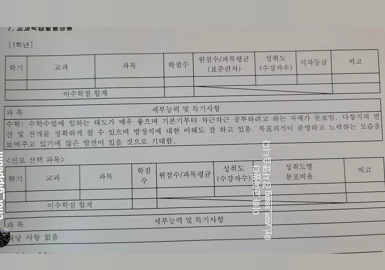 수학: 수학수업에 임하는 태도가 매우 좋으며 기본기부터 차근차근 공부하려고 하는 자세가 돋보임. 다항식의 연산 및 전개를 정확하게 할 수 있으며 방정식에 대한 이해도 잘 하고 있음. 목표의식이 분명하고 노력하는 모습을 보여주고 있기에 많은 발전이 있을 것으로 기대함.