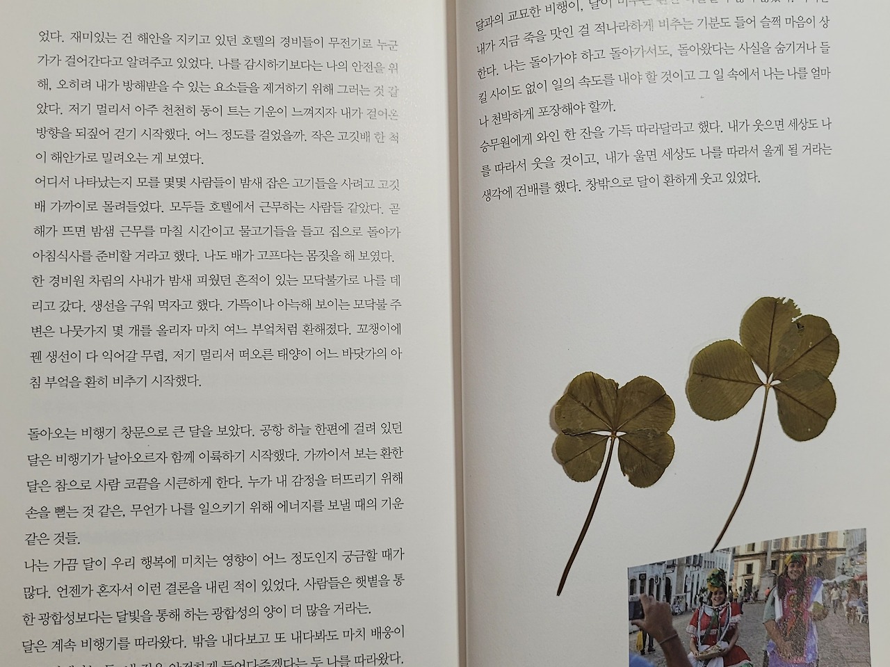 이미 알고 있던 글과 사진들이지만 간격을 두고 보니 새로웠다. 이제 집에 왔을 때마다 읽을 수 있는 책에는 한계가 있을 테니 나는 책을 아껴 읽기로 했다. 그래서 그 주말의 끝, 네잎클로버도 원래의 페이지에 넣어 책을 고이 덮은 뒤 다시 책꽂이에 꽂아 두었다. 다음에 다시 집에 왔을 때, 언젠가 또 펼쳐본 그날의 행운이 되기를 바라는 마음으로. 어느 날의 행운이 또 다른 어느 날의 행운으로 전해질지도 모르니까.