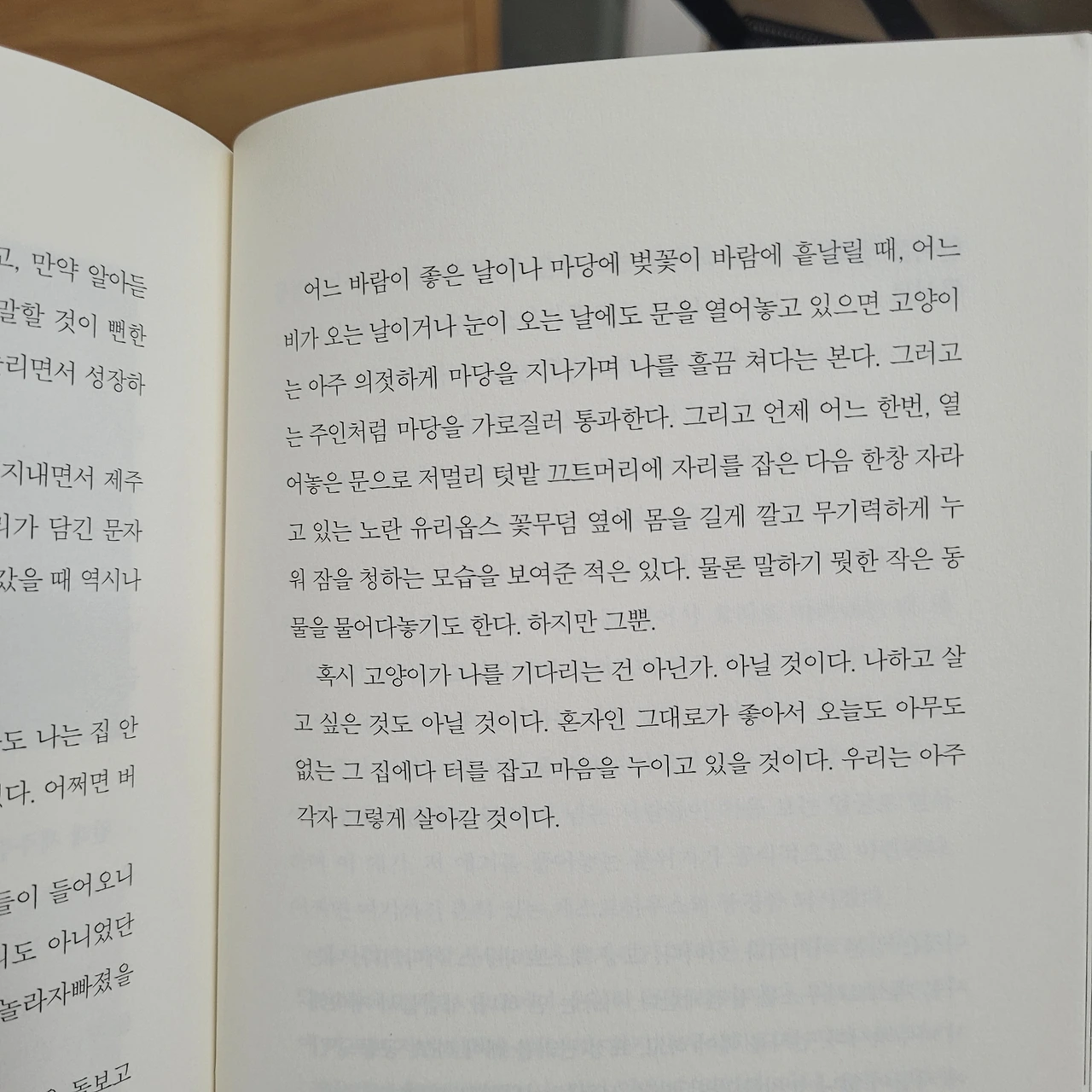 이병률 작가의 산문집 '혼자가 혼자에게'의 한 페이지. 지난 주말엔 이 글을 소리 내어 읽었다. 집 마당을 아무렇지 않게 드나드는 길고양이의 이야기. 그저 혼자인 것이 좋은 고양이가 자유로이 돌아다닐 수 있게 놔두고, 그 무심함에 서운해하지도, 그의 생각을 읽으려고 애쓰지도 않는다. 그저 바라만 보고 기록했을 뿐이다.