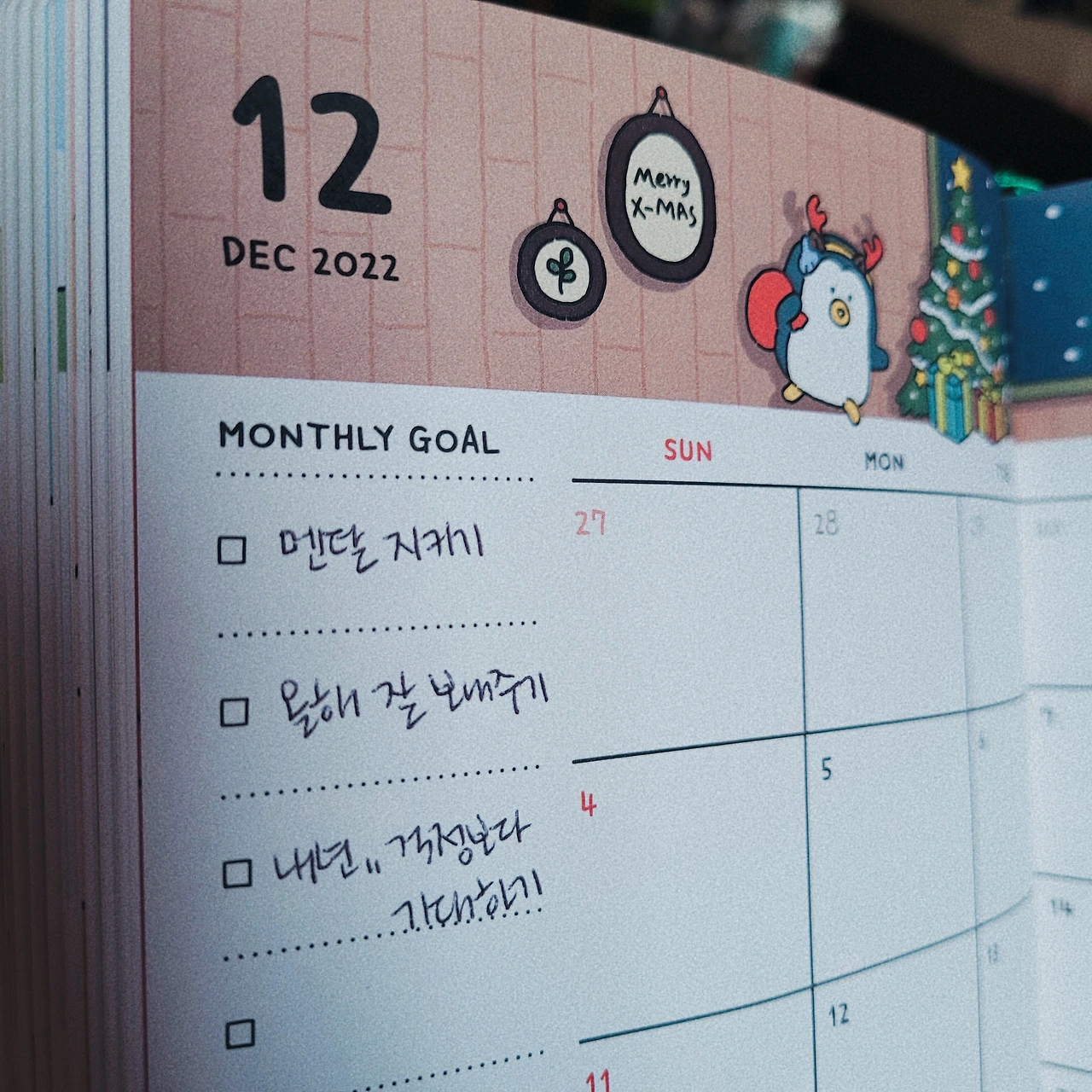 12월이 되자, 올해의 다이어리가 얼마 남지 않았다는 게 또 실감이 됐다. 그렇게 다이어리가 몇 장이나 남았나 뒤적거리다 보니, 맨 뒤에 부록으로 들어있던 스티커 몇 장이 뒤늦게 발견됐다. 꽤나 귀여웠고 종류도 다양했다.